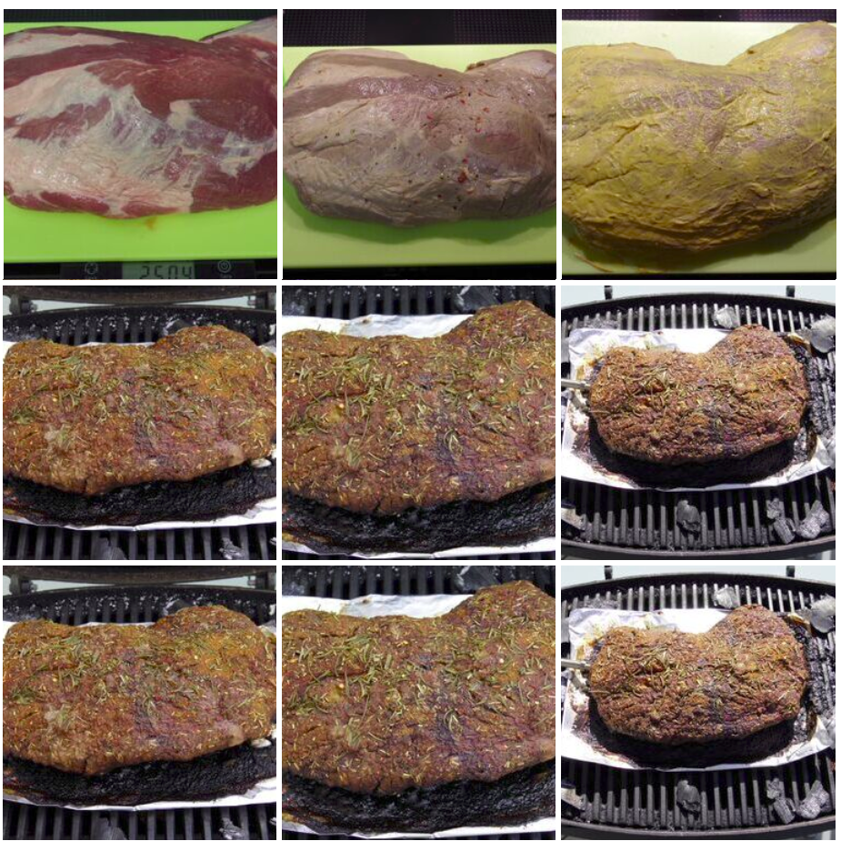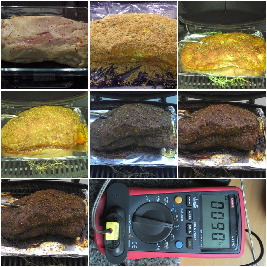 Basically, the first attempt was a success but since thinks went quite fast regarding core temperature rise (almost 0.6K/min) the task was open to make things better. I am almost convinced now that the grill brings in the heat mostly from the bottom (due to the almost 85% covered grill area), so that when the cooking chamber thermocouple under the lid reaches 100°C, the bottom side of the meat experiences much higher temperatures and therefore heats up too fast.