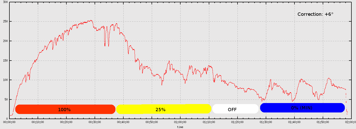 The simplest solution was to reinstall the electric heater which already features a temperature regulation with the inbuilt thermostat. Unfortunately there was no information availabe for the lowest working point of this regulator so this should be added here. The picture below shows the cooking chamber air temperature in degree-Celsius (measured with a thermocouple 6cm above the grid, shielded by a 15x15cm piece of aluminium foil on the grid). After approx. 1/2 hour the grill leveled out at roughly 260°C (correction of +6K applies to the shown values) on full power. The test was conducted in January with +4°C ambient temperature, so for typical summer party climates, the maximum cooking chamber temperatures could be easily 10K higher than measured. The regulated temperatures for intermediate powersettings should be theoretically independent of the ambient temperature. At estimated 25% powersetting, the temperature was reglated between 100°C and 150°C. With the minimum setting the operation points went down between 50°C and 100°C.