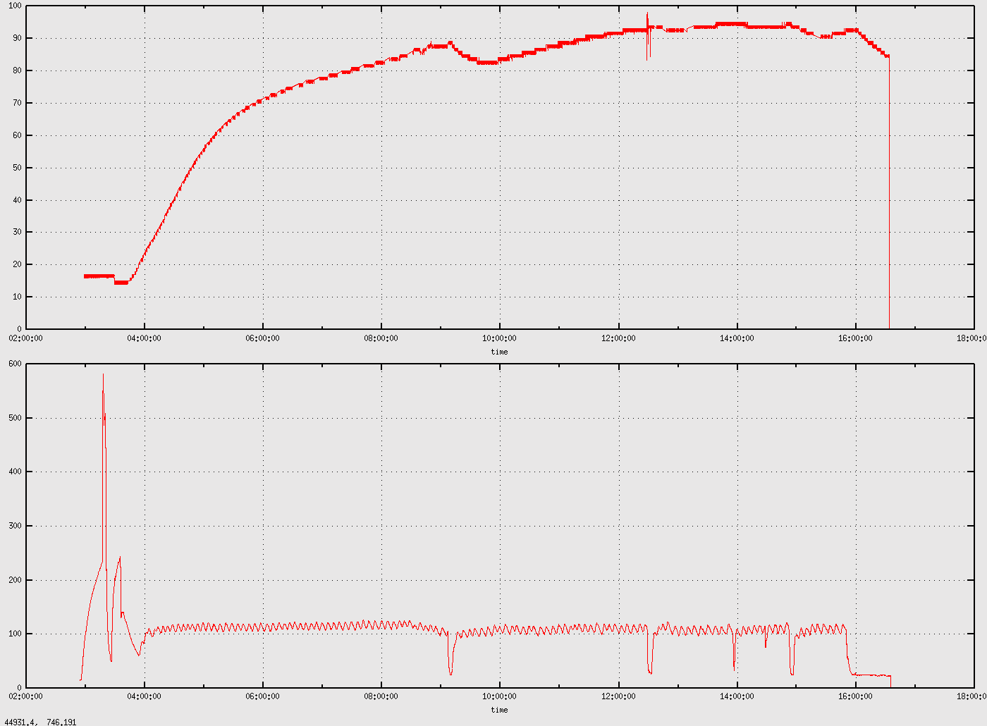 Above you see the core temperature at the top and the cooking chamber temperature at the bottom over a time scale of hours. The spike to 600°C was the wood chips buring in flames, the spikes to the bottom reside from opening the cooking chamber for applying the mop and spurious nosiness.