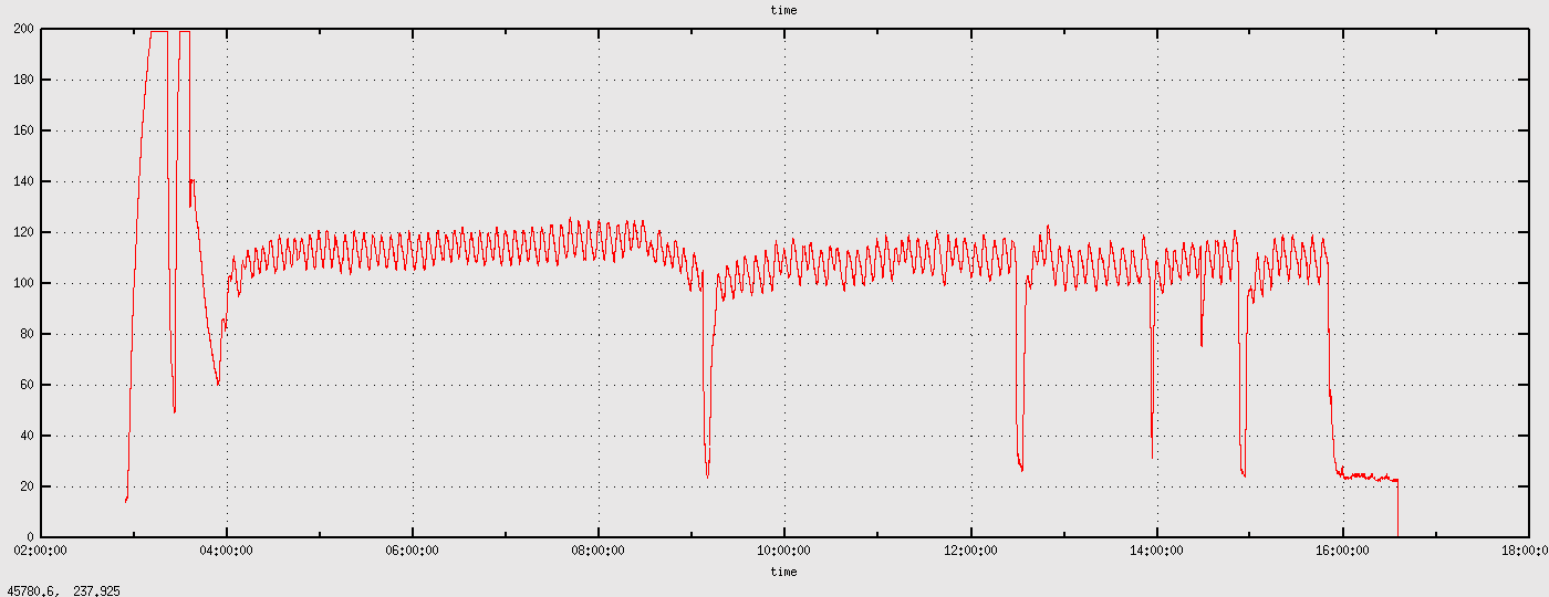 I adjusted the temperature scale in the chart below so that the more important cooking temperatures can be seen clearly. Whilst the minimum temperature experiment above was measured with an empty cooking chamber and ahysteresis of over 50K was measured, this time the massive meat lump damped the hysteresis to less than 15K which is acceptable. Nevertheless, a noticable higher thermostat setting was required to reach 110°C cooking chamber temperatures now, so I readjusted the setting. From a later point of view, maybe this was not a good idea since the first plateau with 65°C core temperature was reached already after 1.5h and the melting phase was not very prominent. Over all, the cooking process went on too fast which might be a problem of the high hysteresis of the temperature regulator (reducing the cooking chamber to 100°C did help a bit but after 10h the core themperature reached 95°C and the pork was basically finished). Next time I will started with lower cooking chamber temperatures and adjust it later in the process.