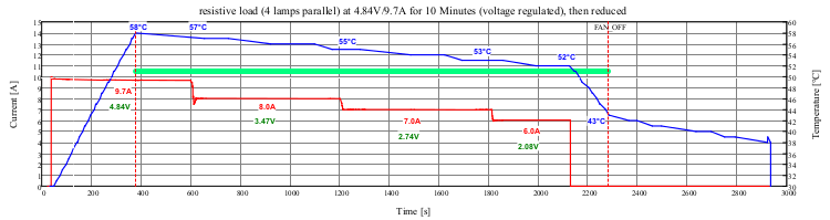 For an optimised measurement of the regulation characteristics under load, a constant resistance dummy load is required. True constant resistors for powers of up to 300W are expensive and hard to find. As an affordable alternative which does not dwindle into an own project, I used 4 halogen light bulbs for 12V/50W which I connected and deconnected in different variations. See here [High power resistive dummy loads] for more details.