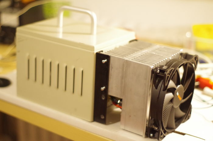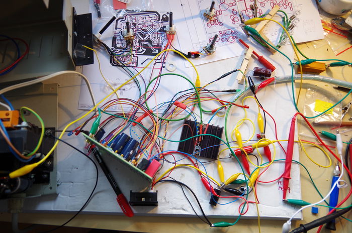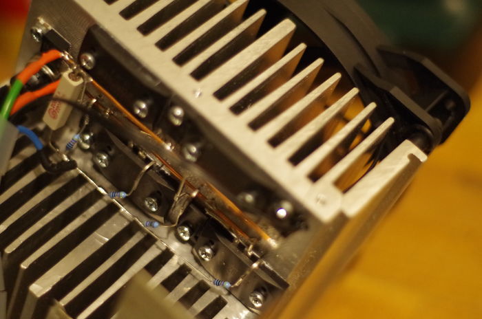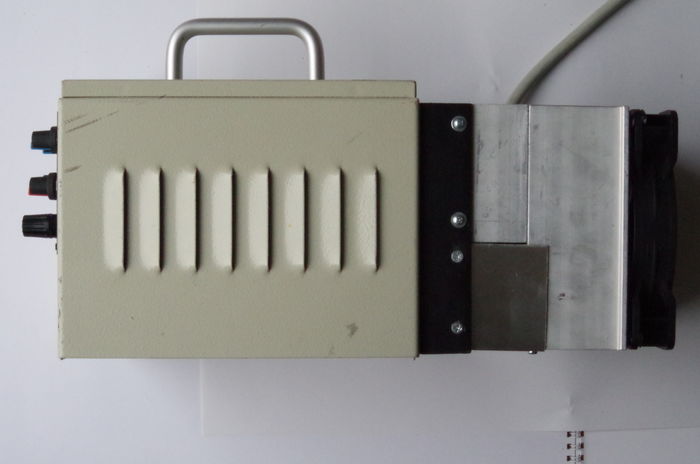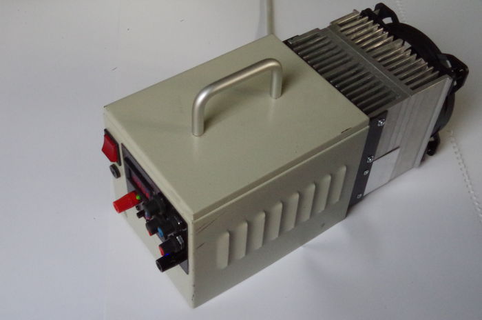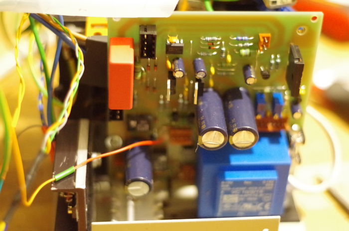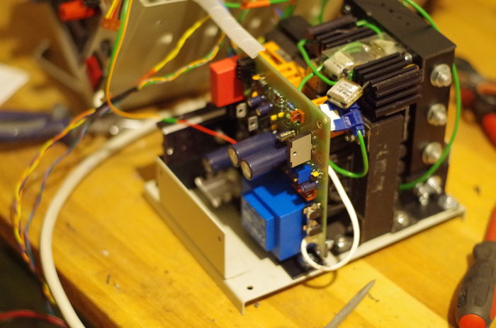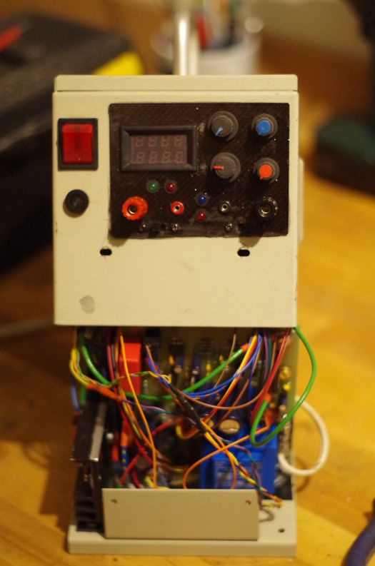 Some brief advise for those who plan to build a power supply on their own:Use a big casing. Although anything worked fine for me (except maybe thermal convection) with my tiny case, I don't like the fact that I do not exactly know where the cables run when I finally managed to close the case with no cables sticking out. A small case has its advantages regarding handyness, but it gets heavy anyway from the other parts like the transformer and heat sink you will need, so it seems to be better to have enough space for a professionell, doubtless cable routing.